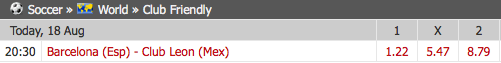 Vamos con este partido de presentación del Barcelona donde se enfrenta al León mexicano,el Barcelona para este partido cuenta con todo su potencial ofensivo con Messi,Iniesta,Neymar parece que también va a jugar y según dijo Luis Enrique Luis Suaez va a tener minutos,el Barcelona viene de golear en el último amistoso y hoy ante este equipo mexicano que esta en plena competición y viene de hacer un vuelo largó el Barcelona debería de ganar fácil y superar el Hándicap.