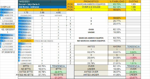 Partido en la Serie A italiana, juegan AS Roma y Udinese, para el pronóstico busco la victoria de los locales, ocupa posiciones de Champions, y según los resultados de hoy, puede beneficiarse si consigue su victoria, enfrente tiene a un Udinese en zona relativamente tranquila, con 24 puntos, el descenso lo tiene a 9 puntos, estos llevan buena línea sus últimos 4 jugados son dos victorias y dos empates, los romanos perdieron con la Juve y con el Lazio, ambos fuera de casa, sus últimos 10 jugados le ponen con 6 victorias, 1 empate y 3 derrotas, los de Udine sólo han conseguido en sus últimos 10 disputados las 2 victorias en sus 2 últimos, con 4 empates y 4 derrotas en los 8 anteriores a esos dos, pienso que el momento de forma en el tiempo es para el equipo local, aunque el rival haya mejorado en sus 4 últimos, ellos no tienen la misma presión, que los de la Roma.