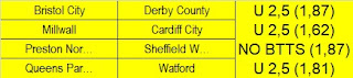 Partido de la segunda inglesa, juegan los equipos de Millwall y de Cardiff,el local es noveno, 4 victorias, 5 empates y 2 derrotas, con 17 puntos, el visitante es el que hace 16 en la tabla, con 4 victorias, 4 empates y 3 derrotas, con 13 puntos, los dos son equipos que pierden pocos partidos, lo que ya nos deja la acumulación de empates que sufren cuando no estas en los alto de la tabla y no pierdes muchos encuentro, para el pronóstico busco el under 2.5 goles, son dos equipos que tienen en lo que han disputado 3 partidos por encima de la línea de los 2.5 goles y 8 por debajo de dicha línea, el Cardiff ha hecho en los 11 disputados 12 goles y le han hecho 11, mientras que al Millwall le han marcado 8 goles y ha conseguido marcar 10, como vemos dos equipos que defienden muy bien a tenor de la cantidad de goles que encajan, pero el dato es que les cuesta hacerlos para por lo menos ganar los partidos.